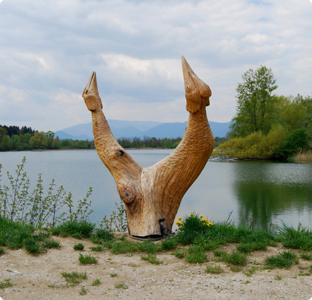 Ekološka učna pot poteka okoli jezera in je dolga približno 3 km. Pot je označena s tablami, na katerih je glava čopastega ponirka, ki vas vodi in usmerja po celotni poti. Ob poti so tudi zanimive informativne table, na katerih so predstavljene bistvene značilnosti območja. Pot je speljana na območju med Savinjo in Strugo, kjer so se ohranili zanimivi življenski prostori, kot so ostanki poplavnega gozda, mejice s travniki, reka s prodišči ter seveda ribnik. Omenjeni življenjski prostori so v dolini redki ali jih sploh več ni. Pot poteka v celoti po ravnini in je brez težav dostopna vsem starostnim skupinam v vseh letnih časih.